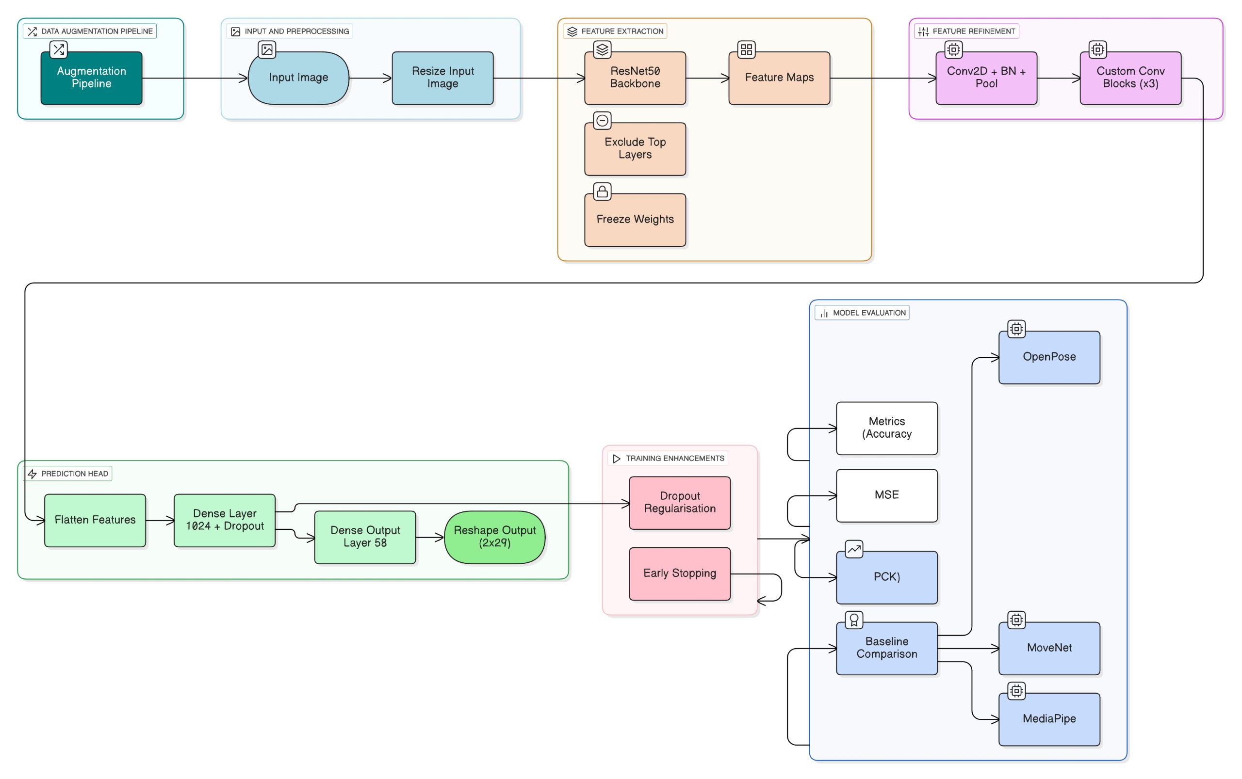 29 × 2neurons (for 29 keypoints, x and y coordinates). - Sigmoid activation ensures normalised outputs in [0, 1].